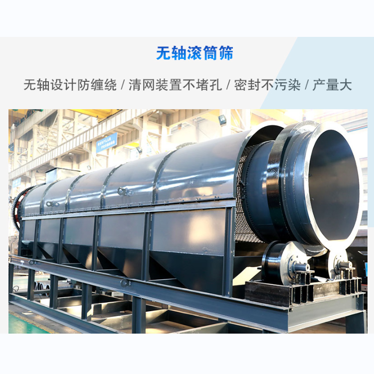無軸滾筒篩采用了無軸設計,避免大件軟質物料纏繞,可以用于對帶狀、纏繞性物料進行分級處理,在整個生產運轉過程中,滾筒在不停的運轉,篩孔不易堵塞,無軸滾筒篩篩分筒可封閉,避免在生產過程中造成塵土飛揚現象。
